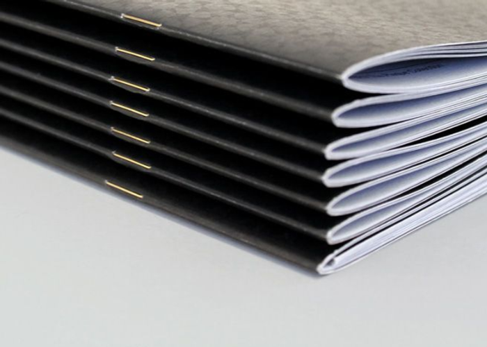 Popular for booklets, magazines, and catalogues. folded sheets of paper are nested one within another and attached by staples through the spine