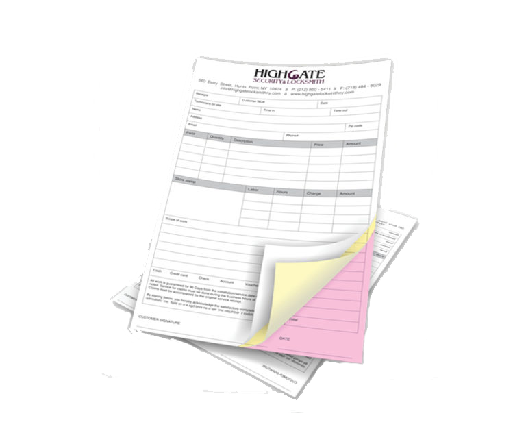 Carbonless Forms provide the easiest and most functional method for receipts, order forms, work tickets, agreement documents, and many more business applications. We print in black or colored ink to your specifications. We can also number forms for accurate filing and retrieval for record keeping.